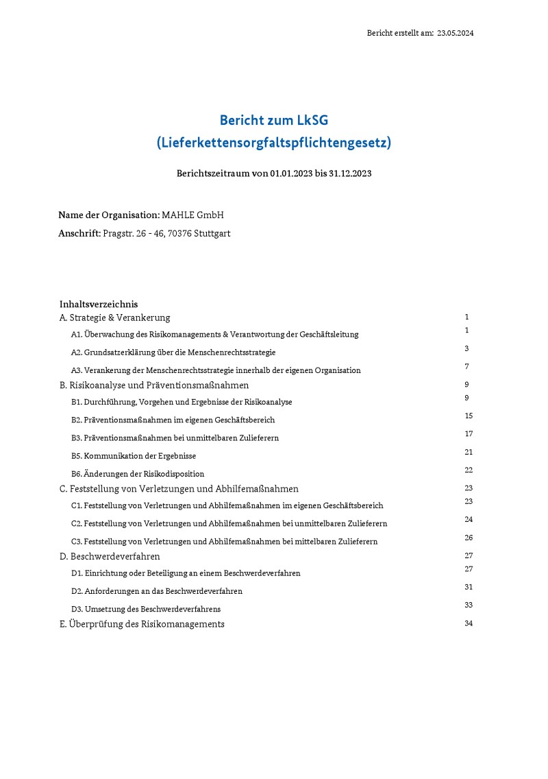 Im jährlichen Bericht an das Bundesamt für Wirtschaft und Ausfuhrkontrolle (BAFA) erläutert MAHLE die Erfüllung der Sorgfaltspflichten nach dem deutschen Lieferkettensorgfaltspflichtengesetz im abgelaufenen Geschäftsjahr.