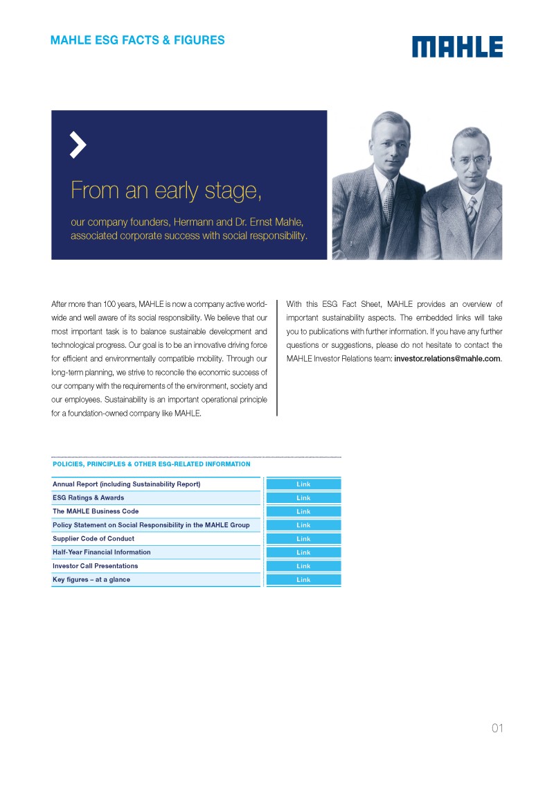 MAHLE publishes annual Sustainability Reports, which explore in detail the topic of sustainability in all business areas. All reports published since 2018/2019 are available online.