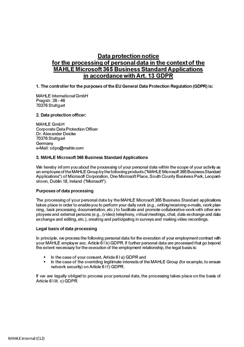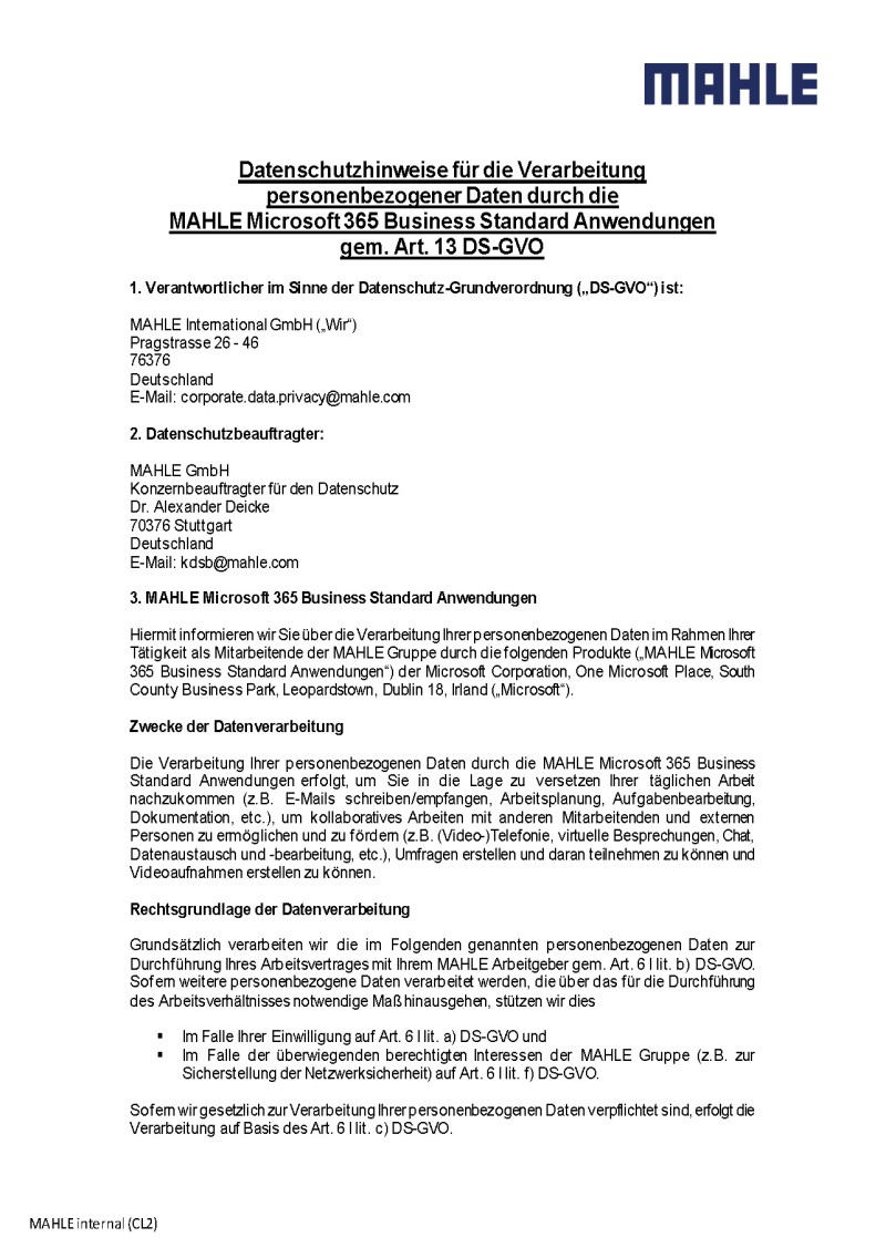 Data protection notice for the processing of personal data in the context of the MAHLE Microsoft 365 Business Standard Applications in accordance with Art. 13 GDPRMicrosoft